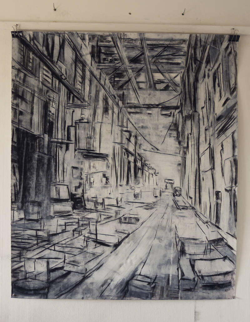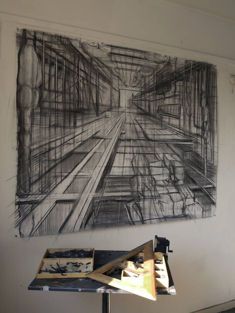 Fabriek van de ontsnappende vormen (2026), houtskool op papier, 110 x 150 cm